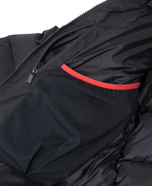 ダウン入りの襟で、冷気の侵入をカットします。