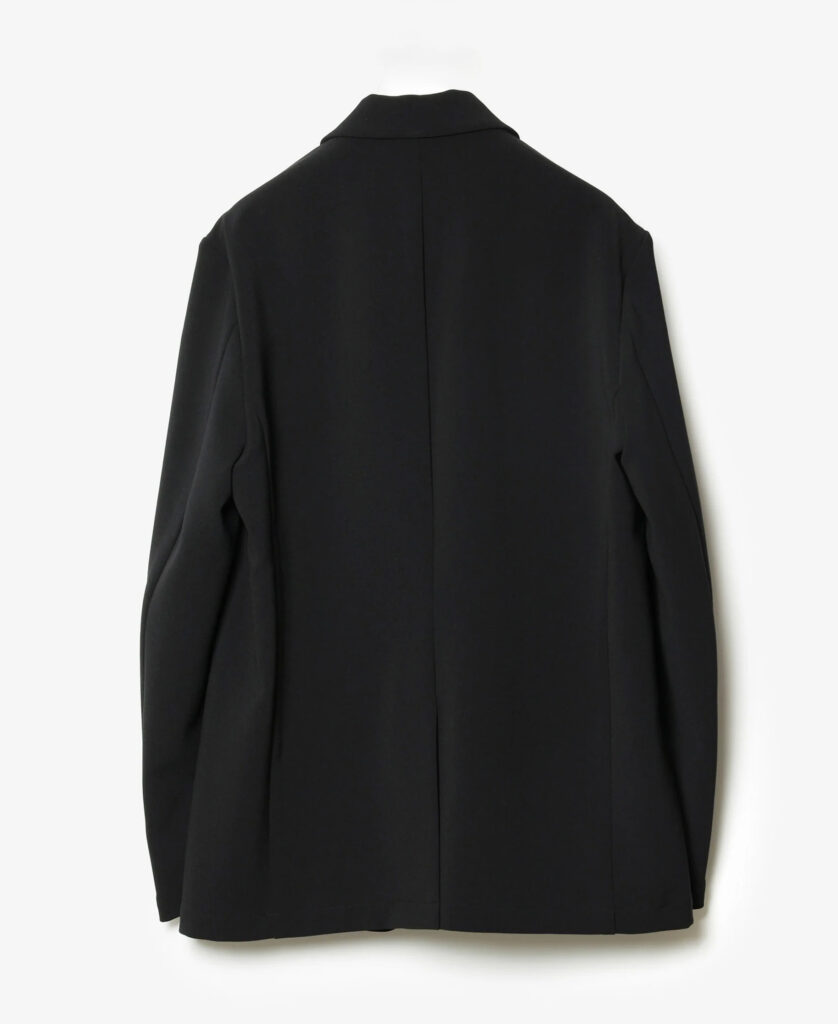 ウールライクなPEストレッチダブルクロス地。ポリエステルフィラメントでありながら、梳毛のトップ糸のようなメランジ感がある。糸自体がマットでパウダリーな質感で、膨らみとストレッチ性も併せ持つ。 ピリングしづらく、シワにもなりにくいイージーケア。スラッシュポケット仕様の2B JKT