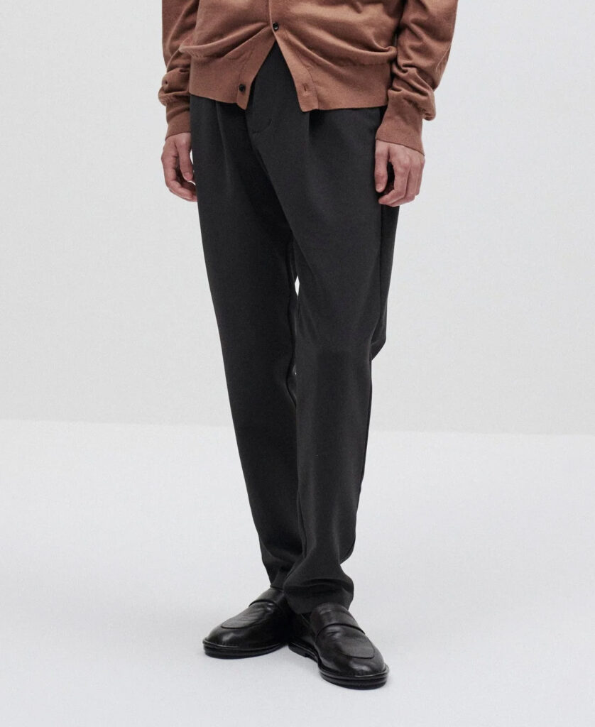 ウールライクなPEストレッチダブルクロス地。ポリエステルフィラメントでありながら、梳毛のトップ糸のようなメランジ感がある。糸自体がマットでパウダリーな質感で、膨らみとストレッチ性も併せ持つ。ピリングしづらく、シワにもなりにくいイージーケア。レギュラーフィットトラウザーズ。